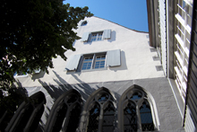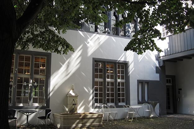 The ‘Schönes Haus’ is a beautifully preserved building in the charming old town of Basel, Switzerland, built around 1271 and used today by the Department of English Studies at the University of Basel. The original edition of De Fabrica might have been printed on the premises of the ‘Schönes Haus’ in 1543; the second edition in 1555 certainly was. Why did Vesalius have the De Fabrica printed in this splendid stately home? In the 13th century when the ‘Schönes Haus’ was erected, it was built for nobility, situated on a beautiful plateau with only a few buildings in its surroundings at the time, giving the owners a fantastic view over the city of Basel. It offered – and still does – a lot of working space with ample adjacent land, which is essential for a printer’s shop. A printer had to handle large quantities of paper and therefore needed large rooms for work and storage, as well as space for shelter for the carts and stables for his horses.